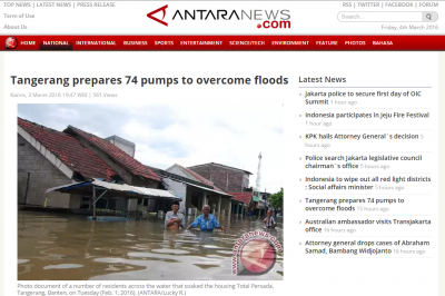 ンゲラン市内の水位は1mに達する所も先月末よりジャワ島を中心に降り始めた大雨によって、ジャカルタやスラバヤなど、ジャワ島内各地では大雨に見舞われた。 バンテン州タンゲラン県では3月1日の24時間降水量が79.1mmに達した。この大雨により、同県内を流れるCim…