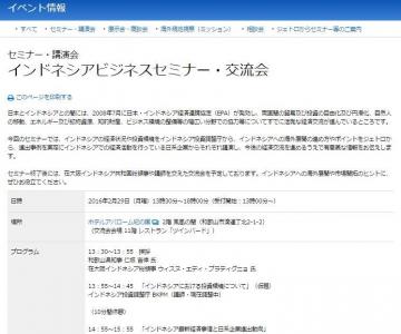016年2月29日、和歌山県和歌山市にて開催2016年2月29日、和歌山県和歌山市にて、インドネシアビジネスセミナーと交流会が開催される。 主催は、在インドネシア総領事館、和歌山県、わかやま産業振興財団。共催として、インドネシア投資調整庁、ジェトロ大阪。和…